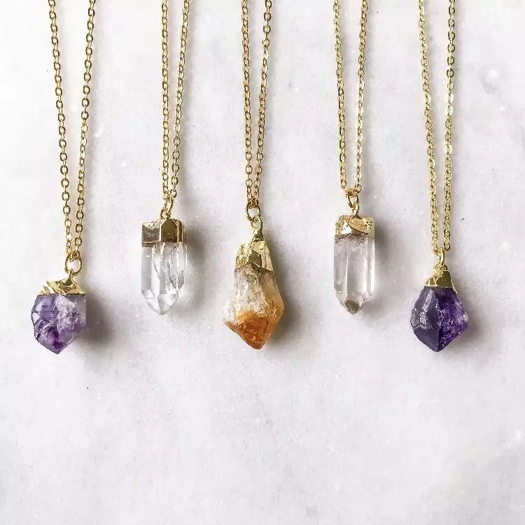 Beautiful natural crystal point 18k gold necklaces. Choose between Clear Quartz, Amethyst (purple), and Citrine (orange/yellow).