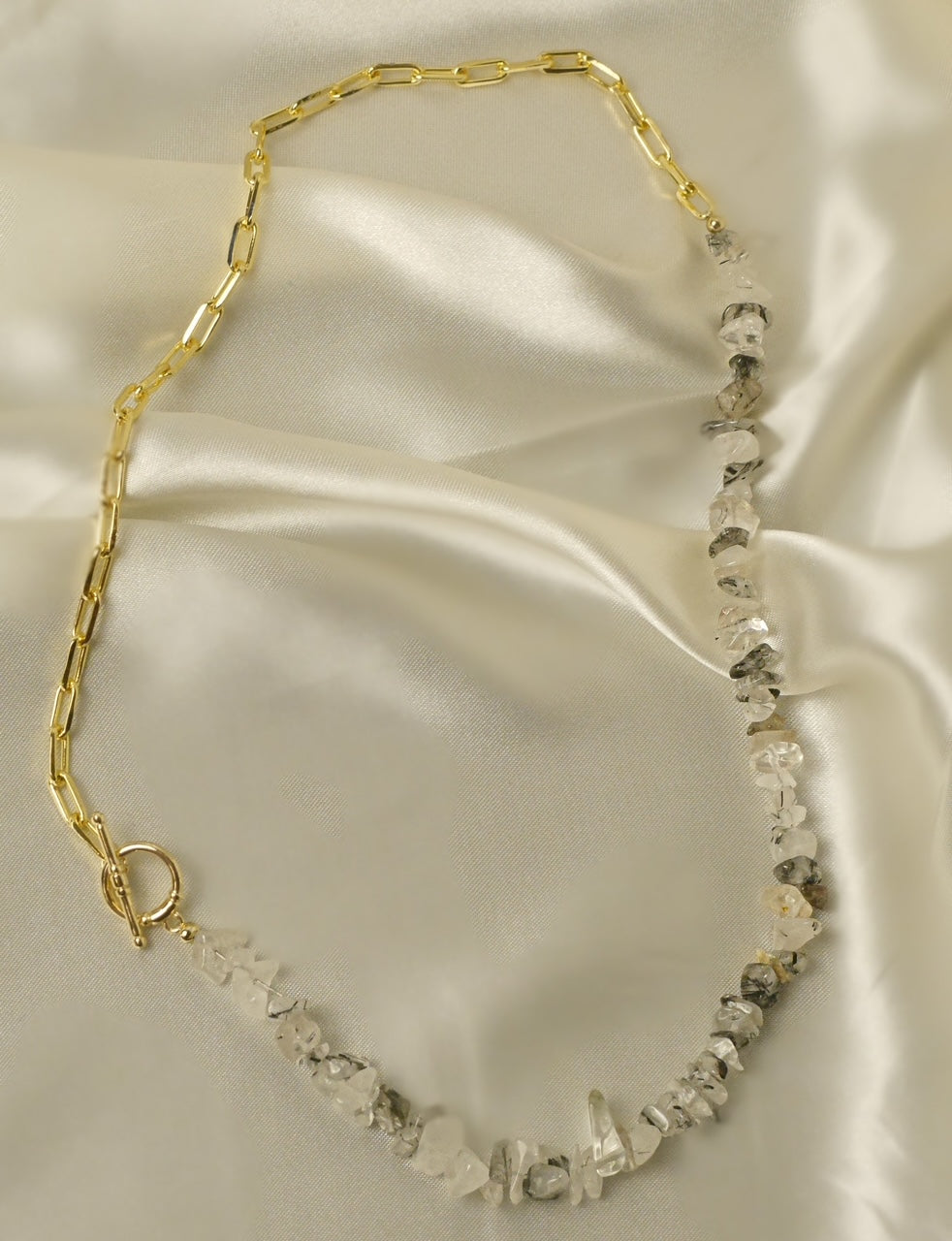 Authentic black rutilated quartz and 18K gold u chain necklace with toggle clasp.