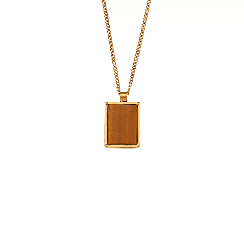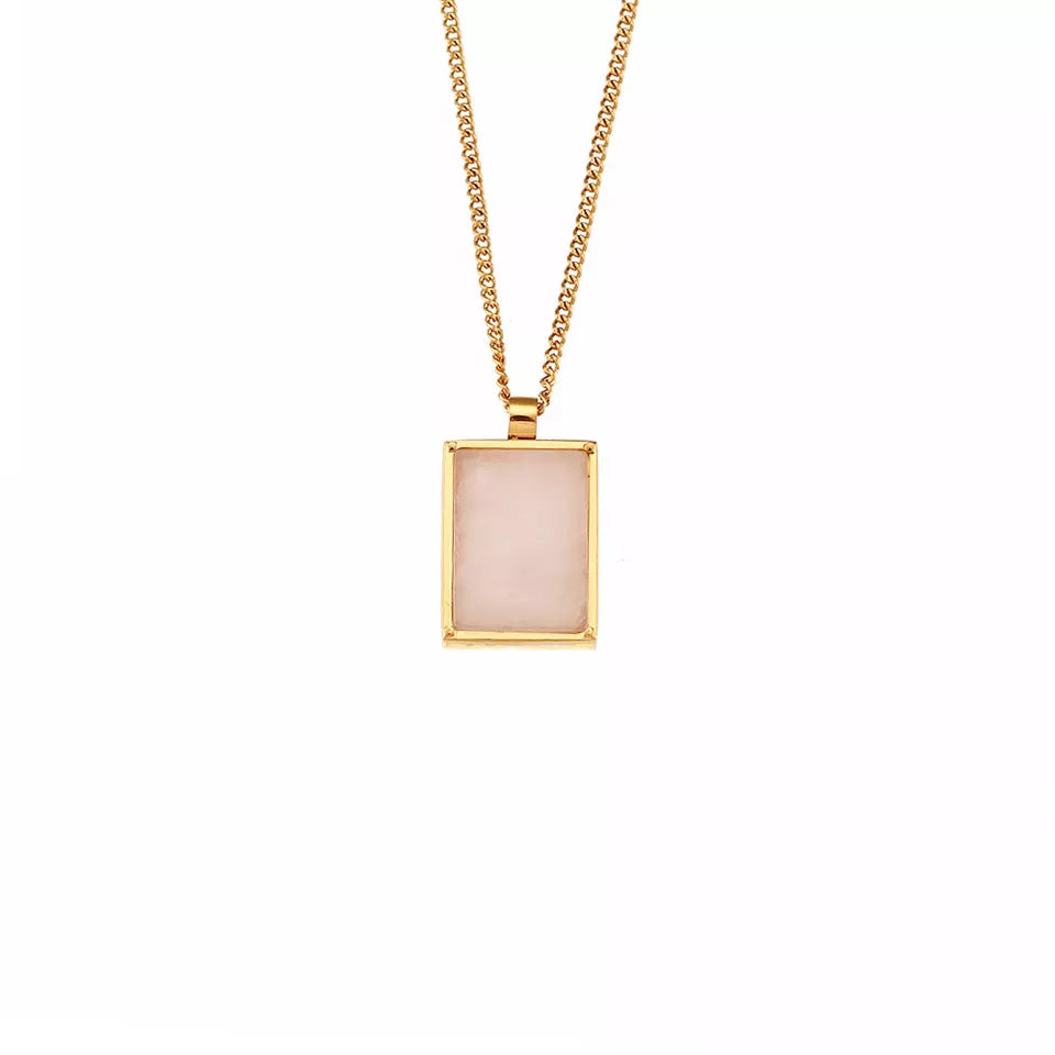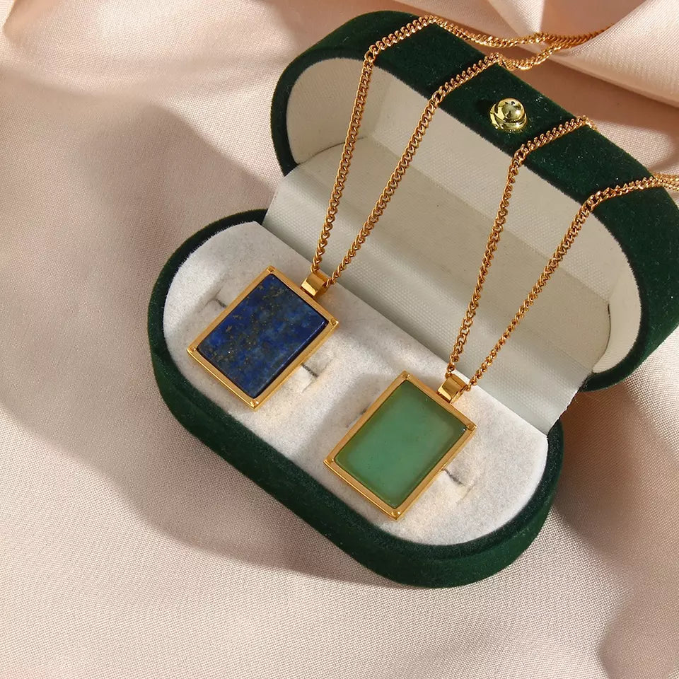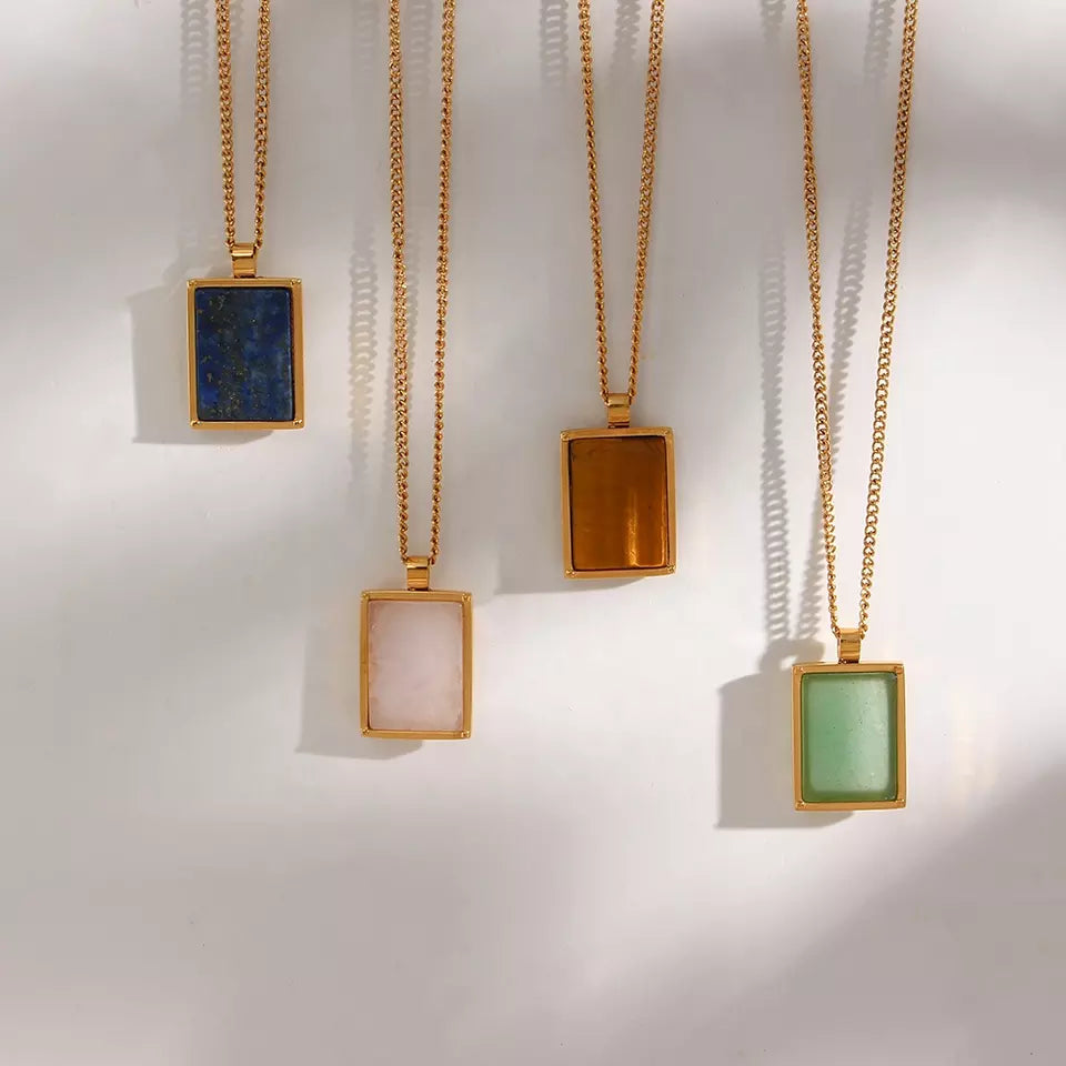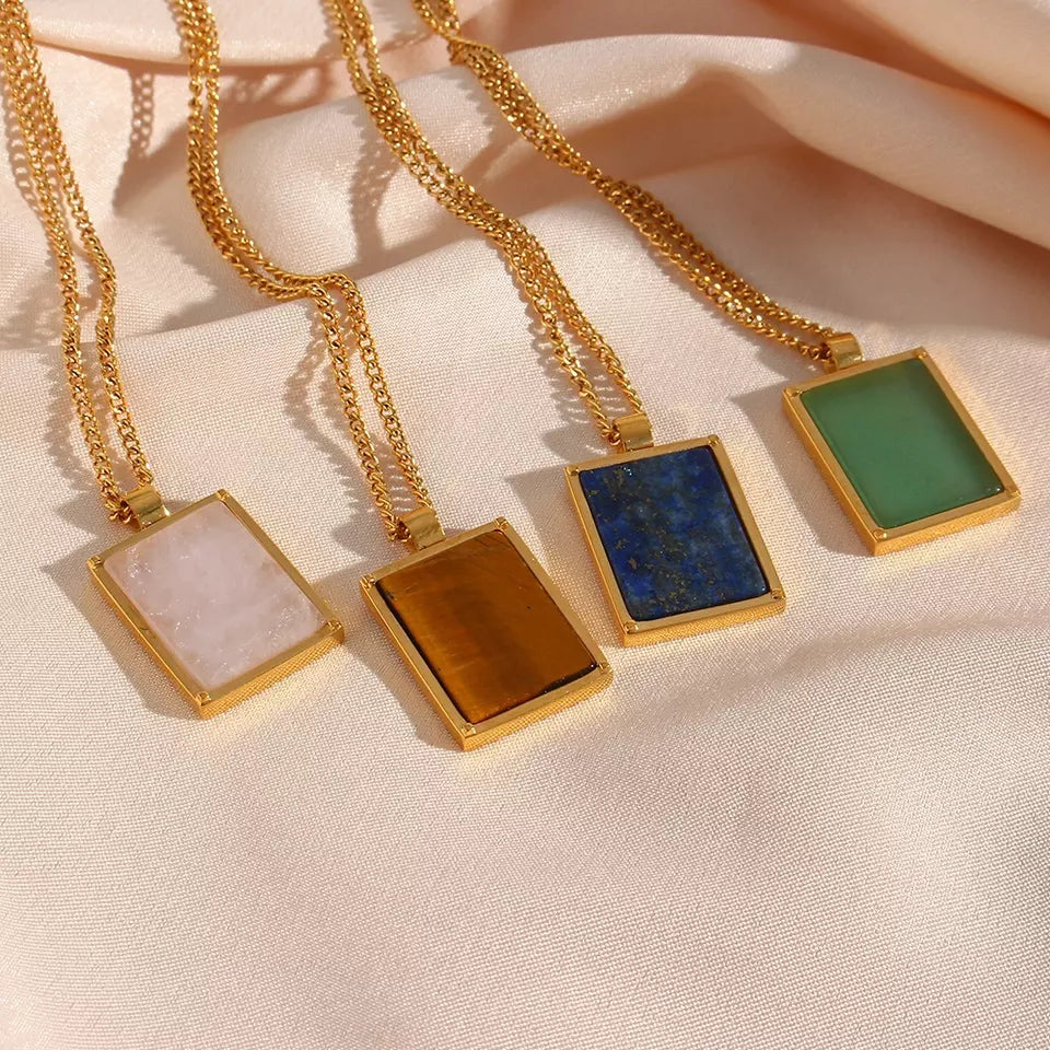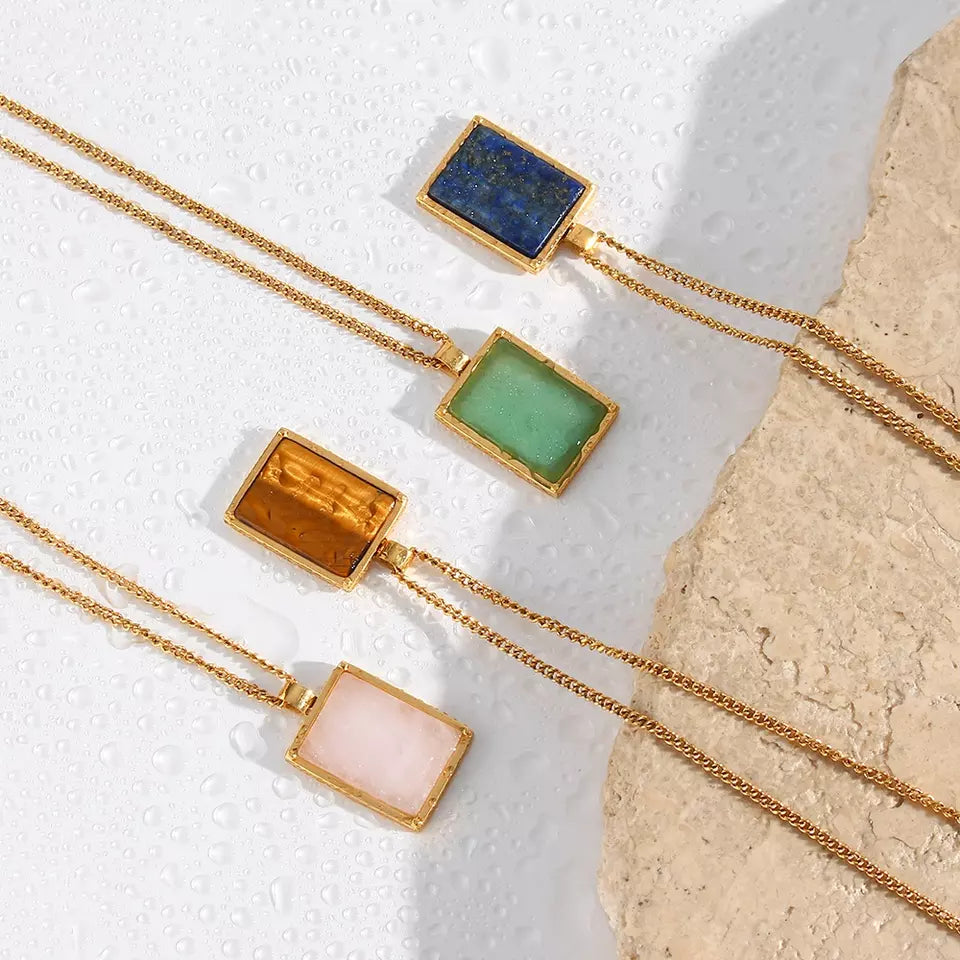These 18K gold necklaces feature nature's most iconic crystals rose quartz (pink), lapis lazuli (blue), tiger's eye (brown) and green aventurine These pieces are made with natural stones so the color may slightly differ from the photo.
