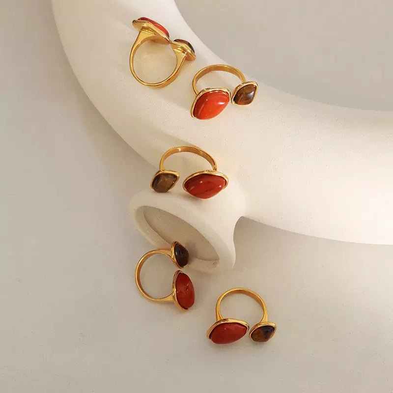 Beautiful and Adjustable Tiger's Eye and Red Jasper 18K gold ring
